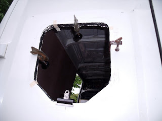 Then we tried to stick the seal on. The seal which came with the window was not wide enough, in fact I don't think you can buy one which is. Also the depth is not the same all the way round, so we ended up cutting in in half. The inside seal sort of stuck, but we screwed it into place as well. The outside seal would not stick, no matter what we used (glue, non-setting mastic, silicone sealant), and also the window wouldn't close because it was so thick. In the end we gave up on the outer seal and stuck draught excluder foam round the outside edge of the window.